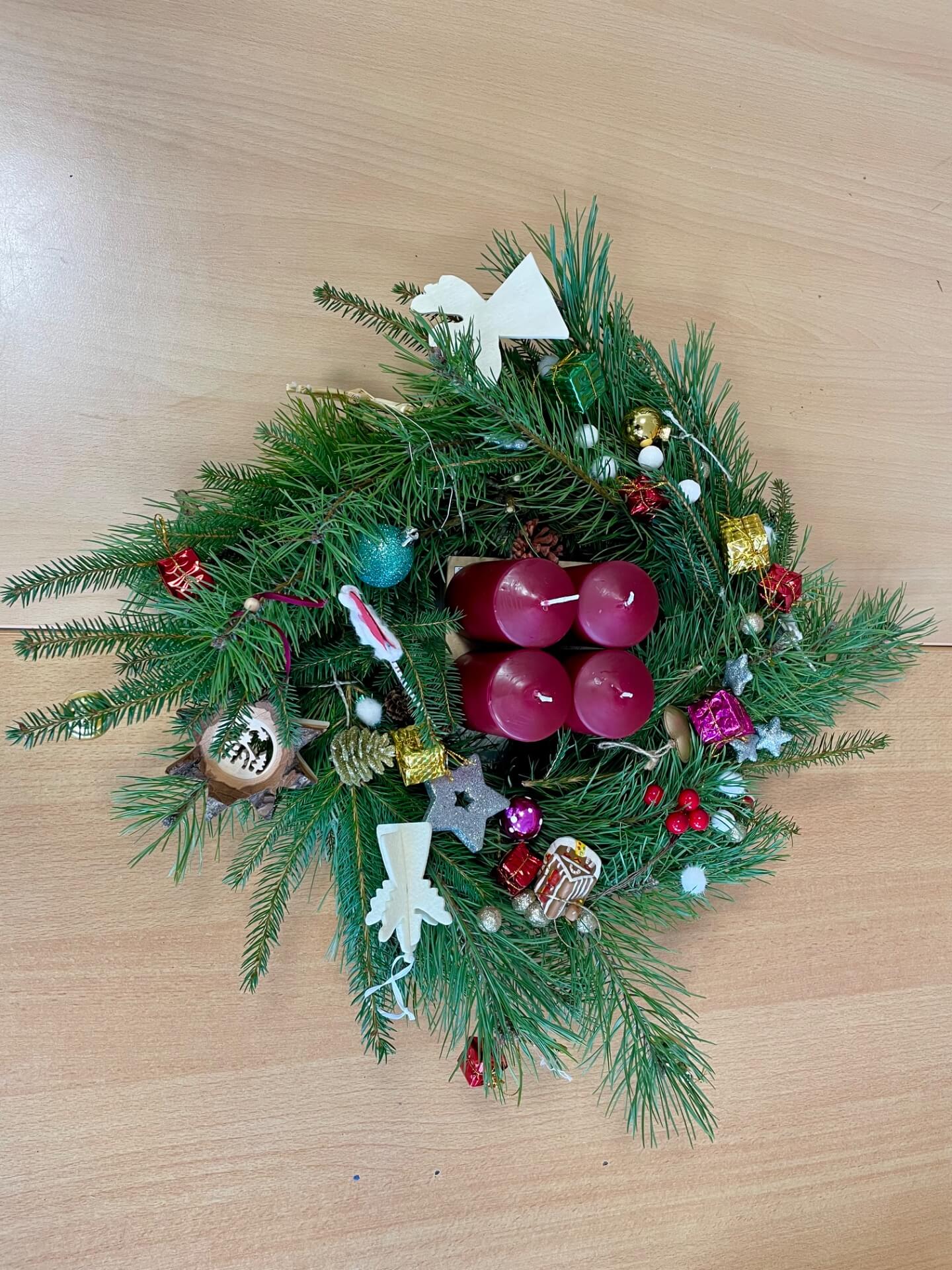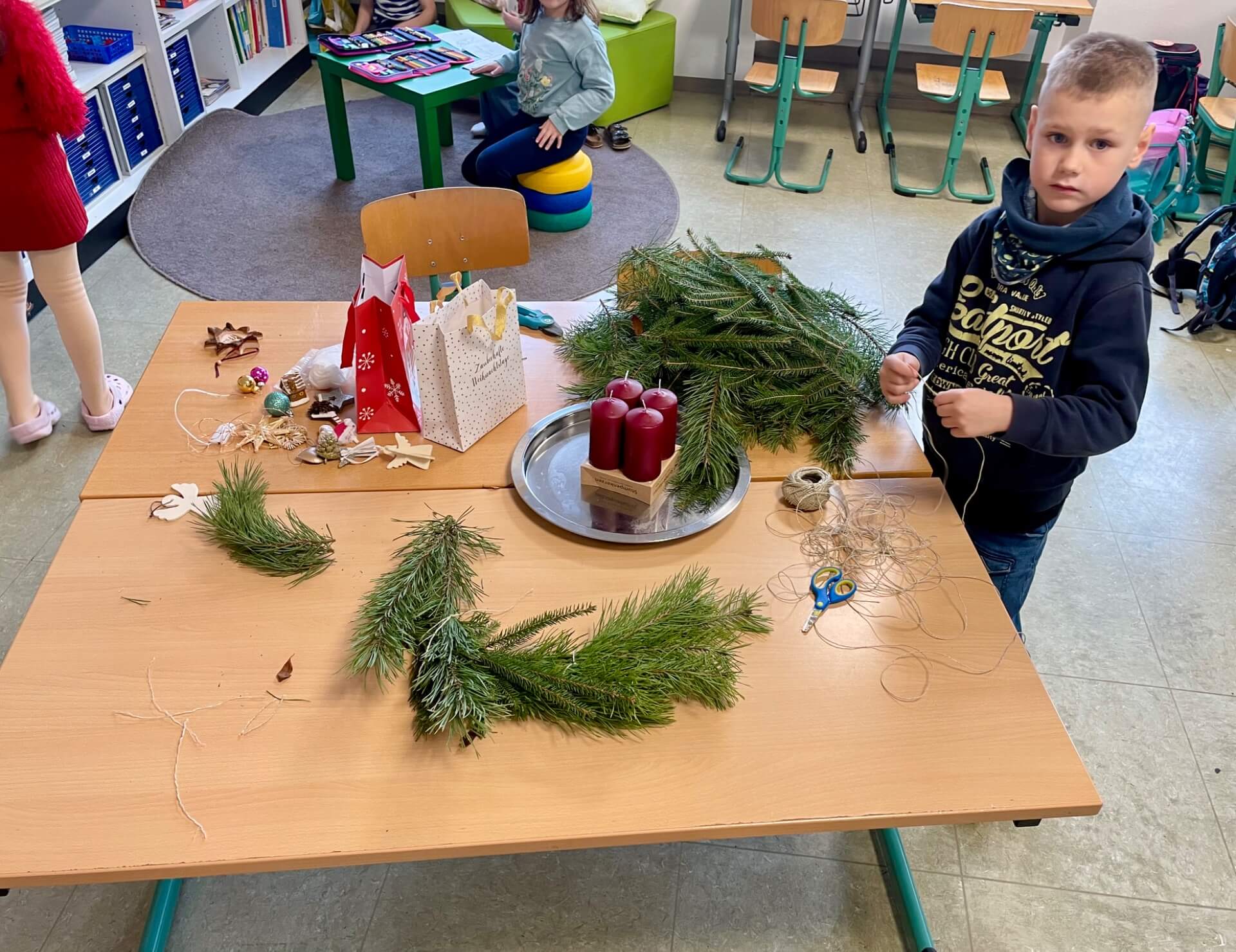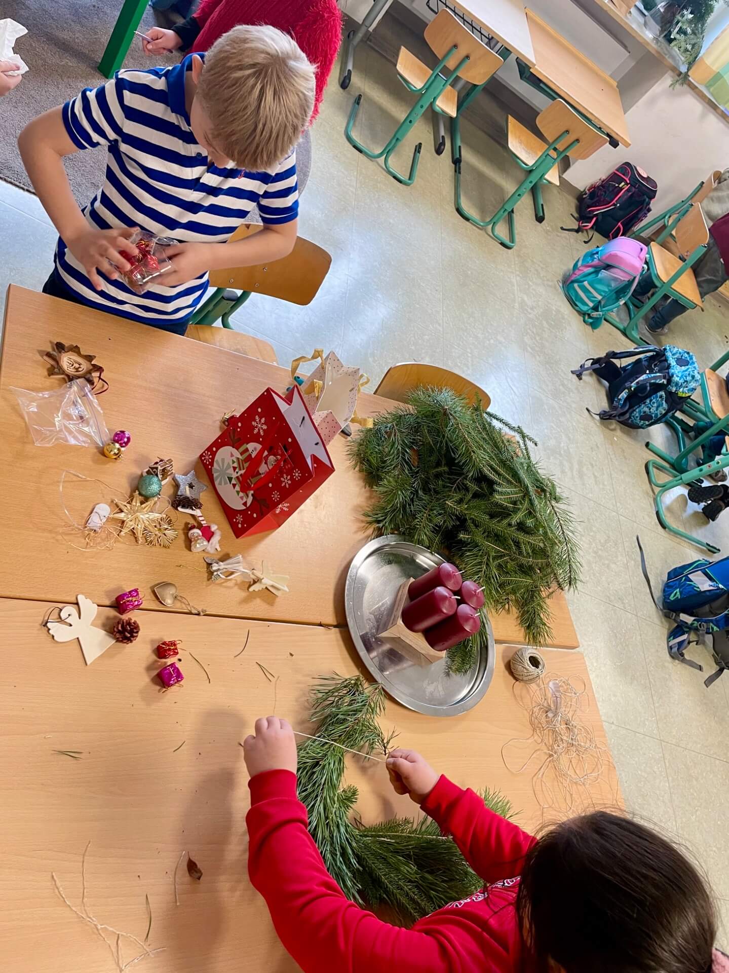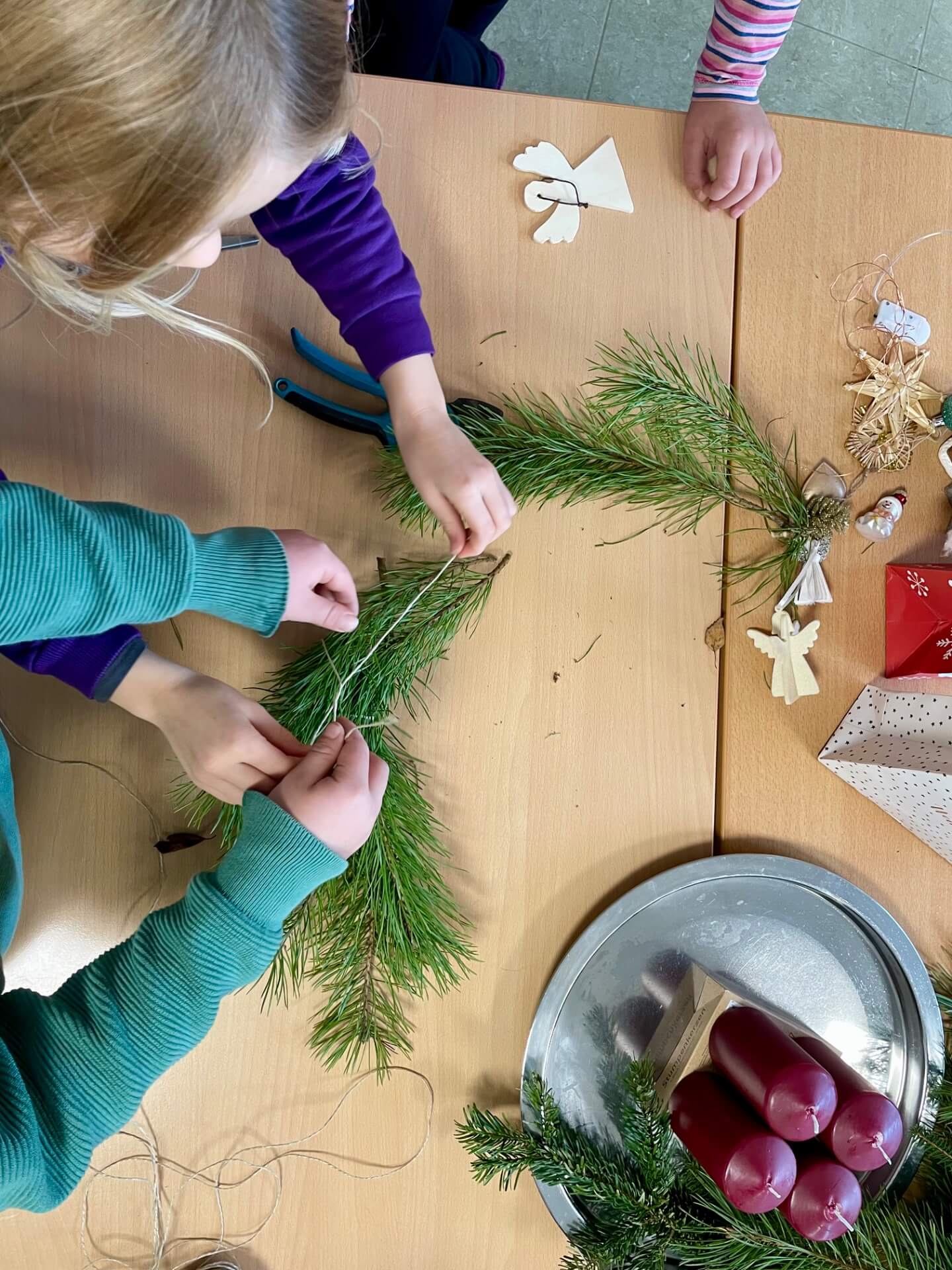 Die Klasse 1a gestaltete selbst einen Adventskranz. Jedes Kind brachte hierzu einen Zweig oder Weihnachtsdeko in die Schule mit. Gemeinsam wurde ein Kranz aus den Zweigen gebunden und mit den vielen bunten Anhängern dekoriert.