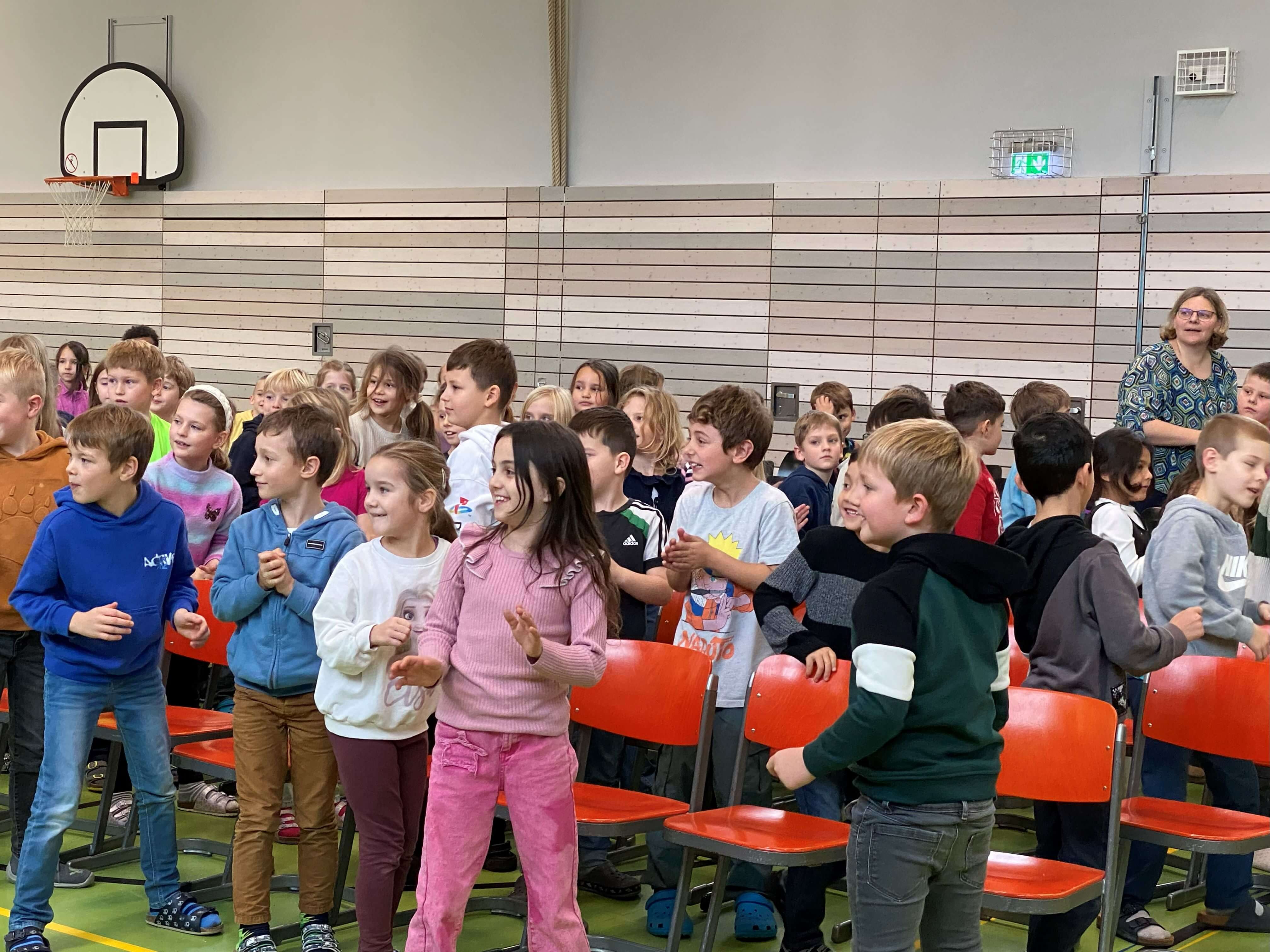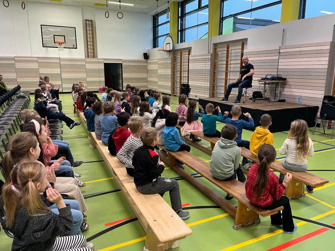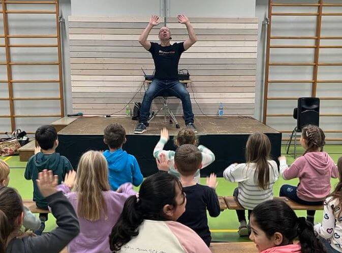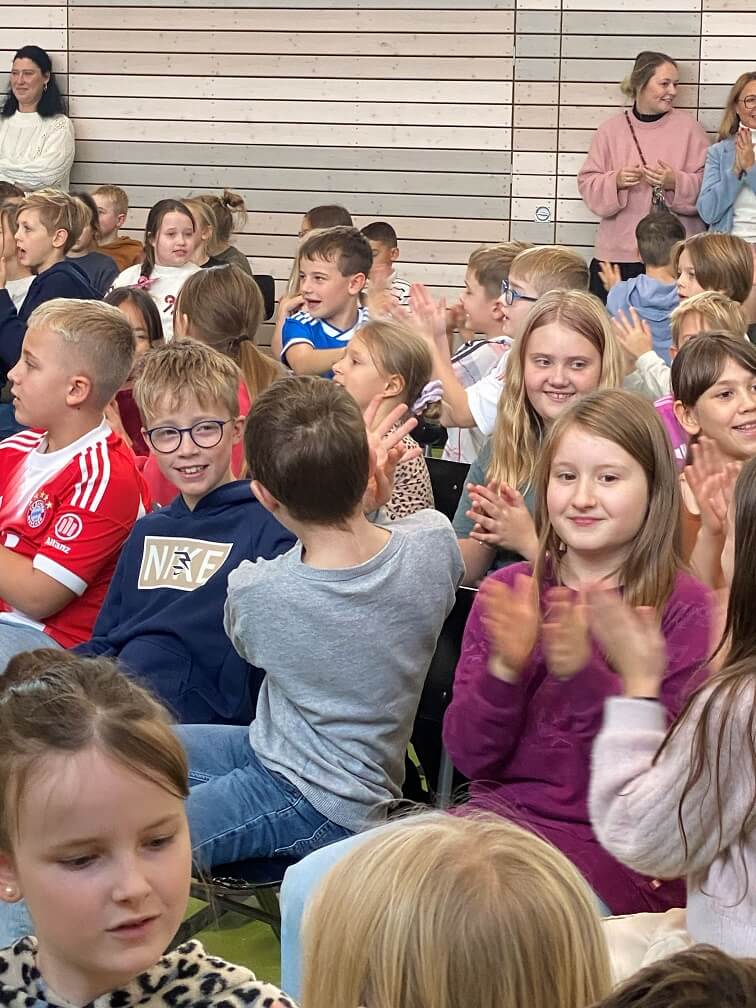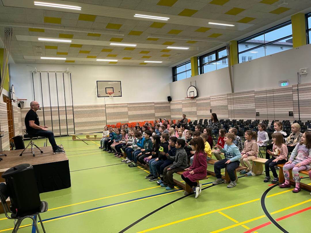 Im November durften wir einen besonderen Vormittag mit Dr. Filz, österreichischer Komponist, Musiker, Autor und führender Experte in Body Percussion, erleben. Jede Jahrgangsstufe arbeitete eine Schulstunde lang an einer Body Percussion-Choreographie. Von trommelnden Bewegungen bis zu synchronen Schlägen entwickelten unsere Kinder gemeinsam mit Dr. Filz ein buntes, lustiges Programm. Dies stärkte nicht nur den Takt, sondern auch Koordination und den Gruppensinn.
