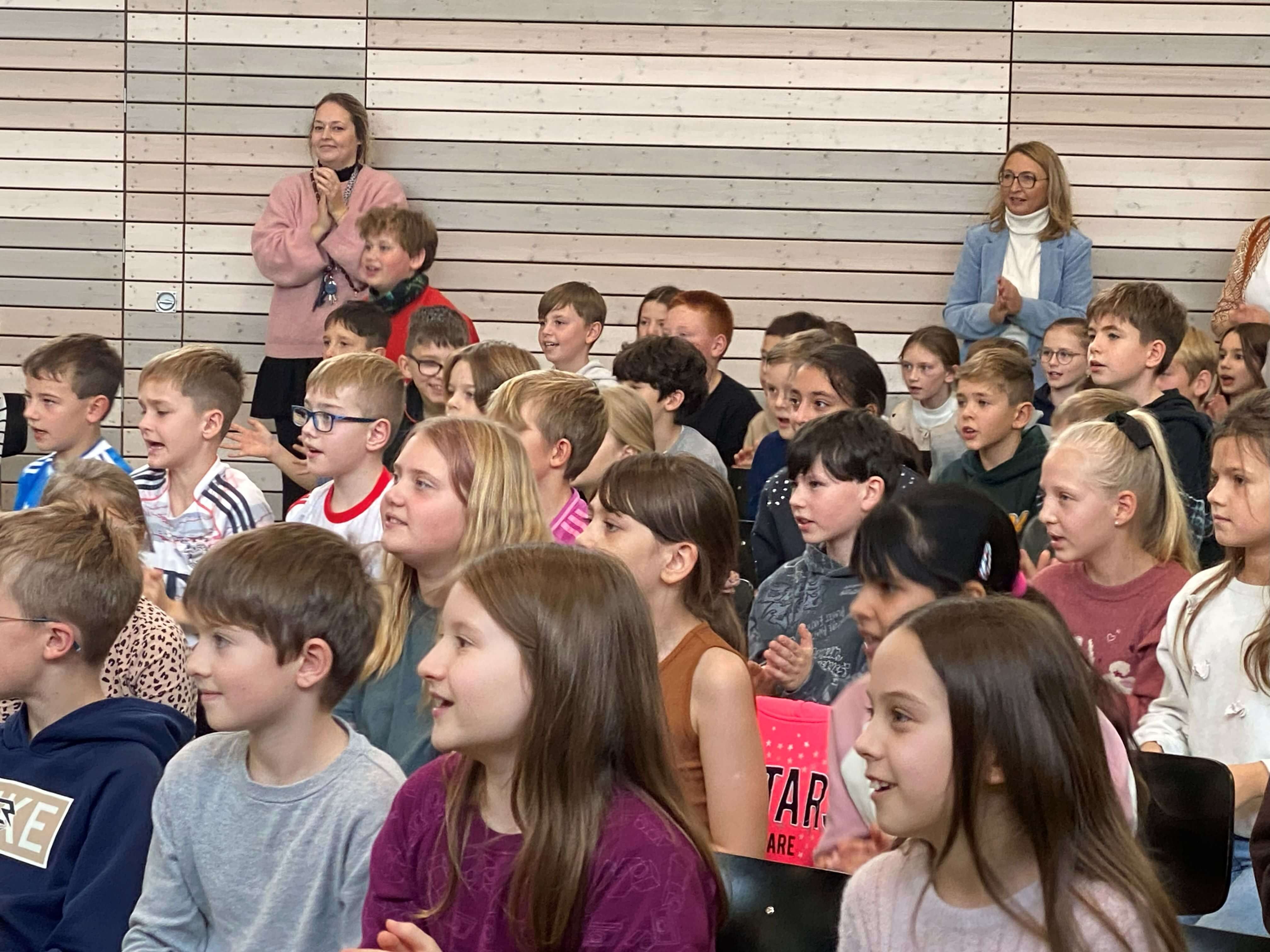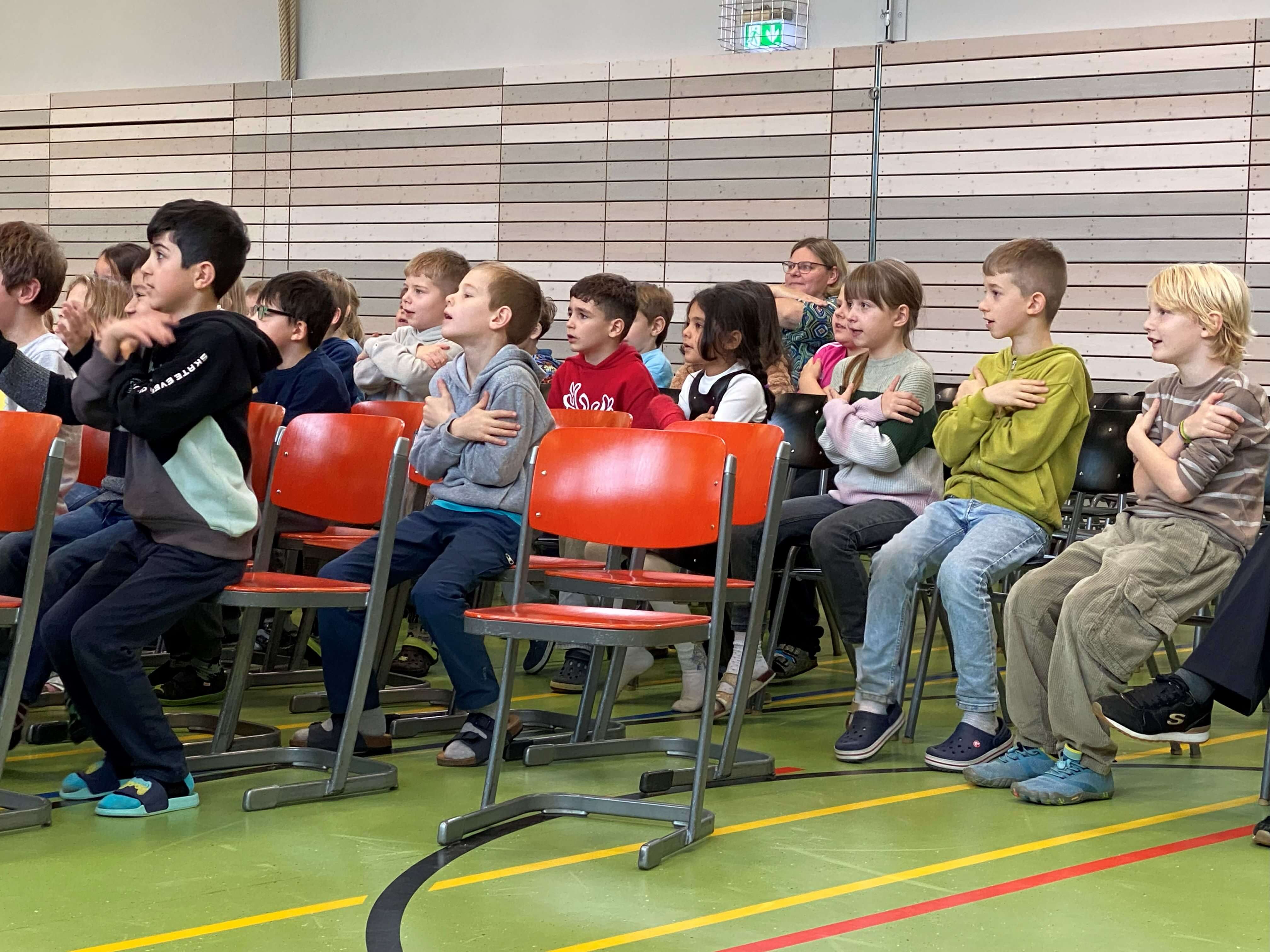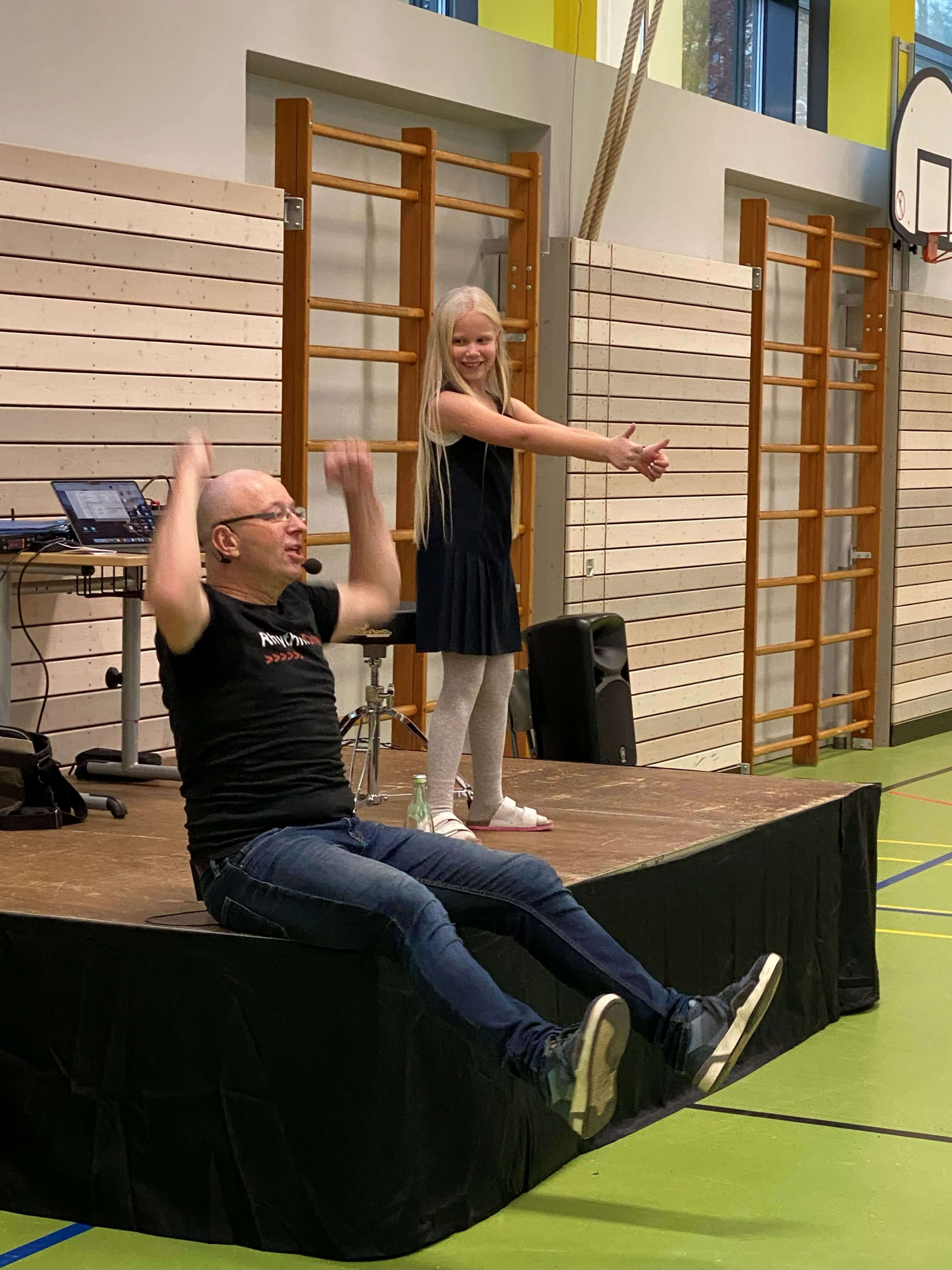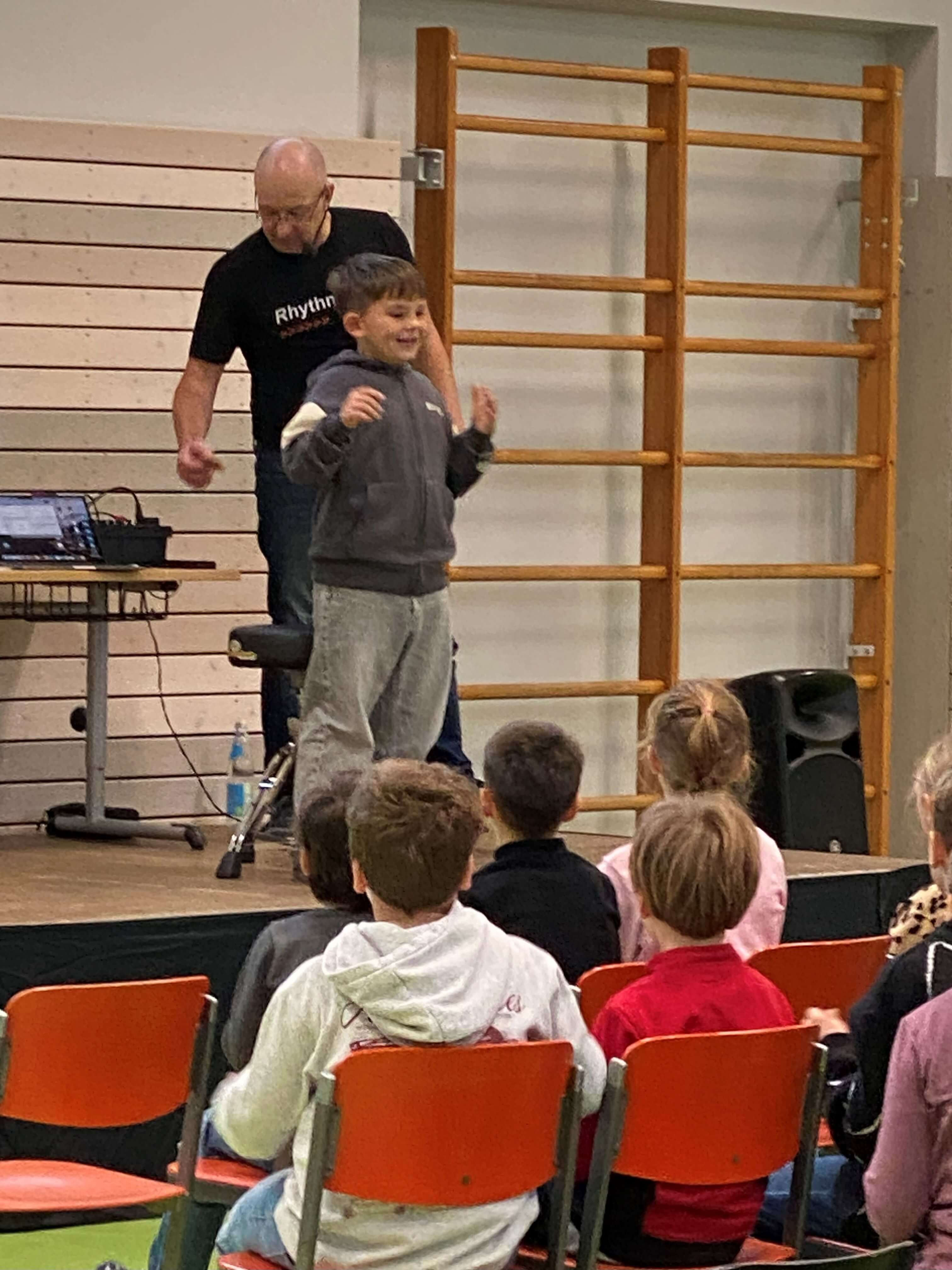Im November durften wir einen besonderen Vormittag mit Dr. Filz, österreichischer Komponist, Musiker, Autor und führender Experte in Body Percussion, erleben. Jede Jahrgangsstufe arbeitete eine Schulstunde lang an einer Body Percussion-Choreographie. Von trommelnden Bewegungen bis zu synchronen Schlägen entwickelten unsere Kinder gemeinsam mit Dr. Filz ein buntes, lustiges Programm. Dies stärkte nicht nur den Takt, sondern auch Koordination und den Gruppensinn.