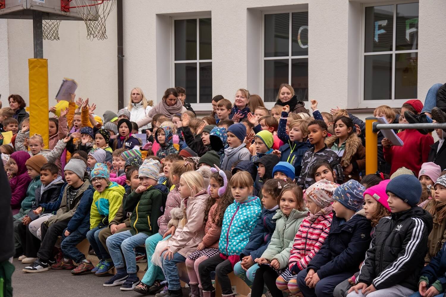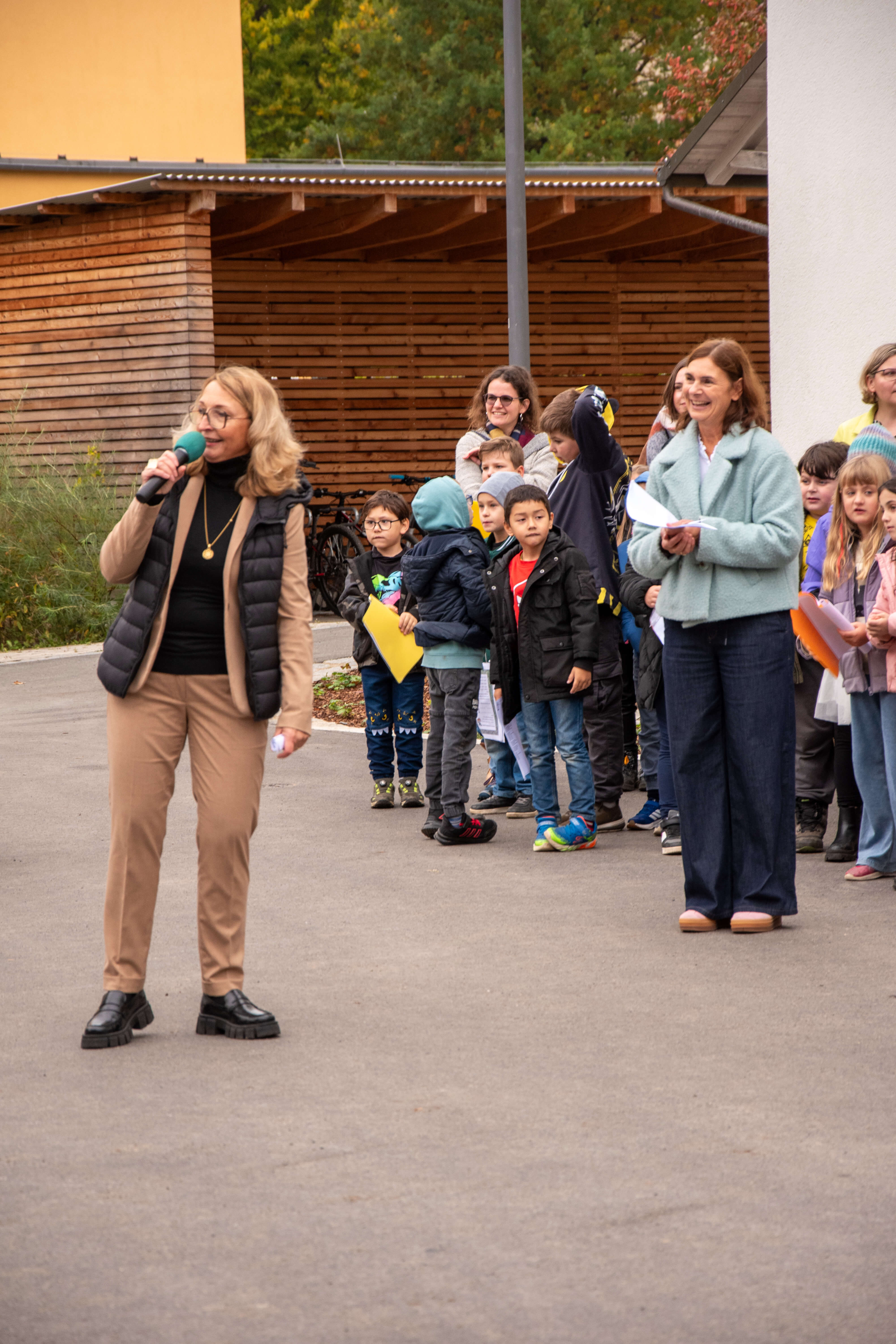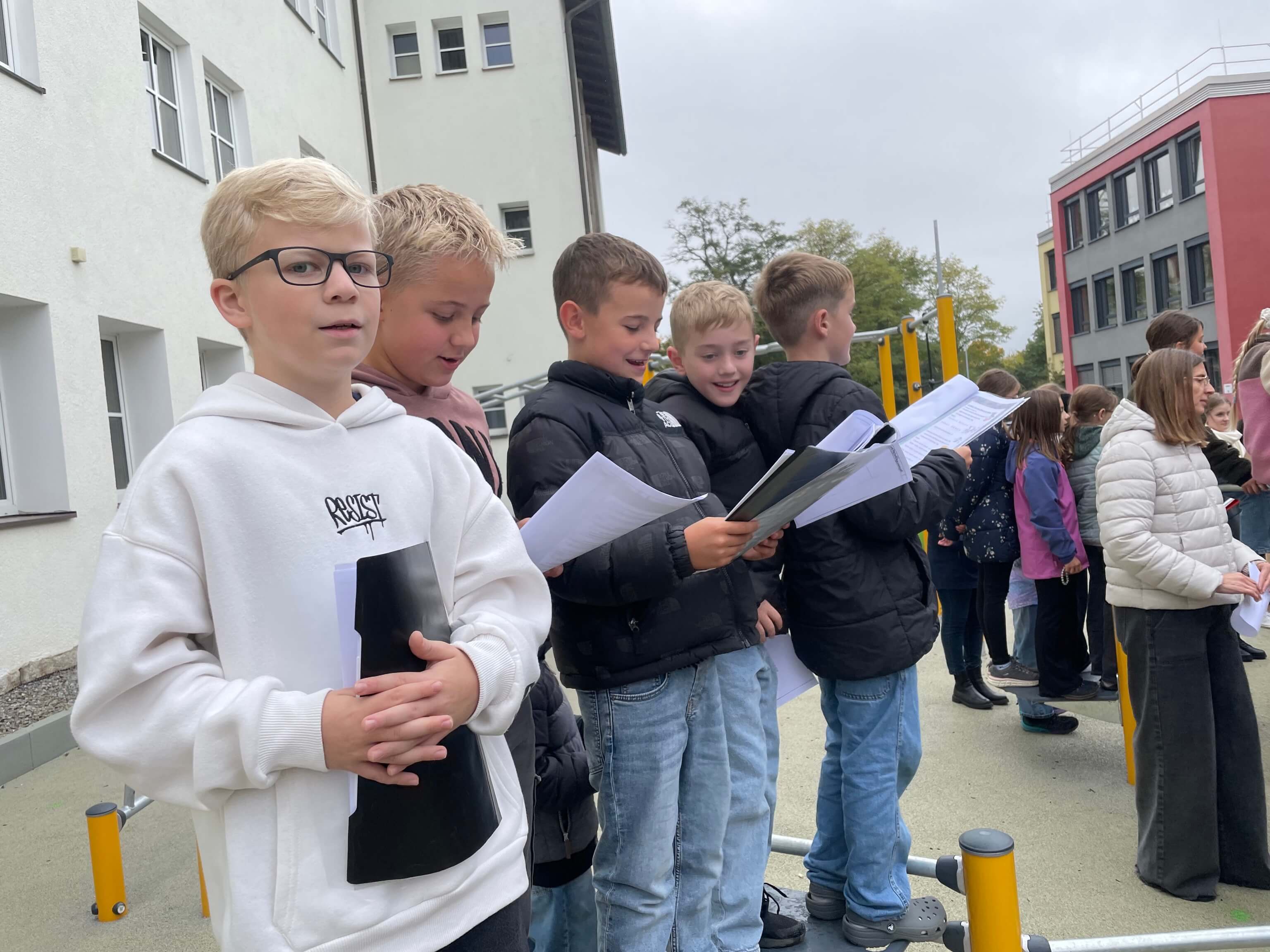 Alle Kinder, Lehrer, Vertreter des Elternbeirats und Fördervereins unserer Grundschule haben sich am Pausenhof versammelt und waren sehr aufgeregt. So lange haben wir der Eröffnung entgegengefiebert! Die Viertklässler haben sogar schon vier lange Jahre auf diesen großen Tag gewartet.
