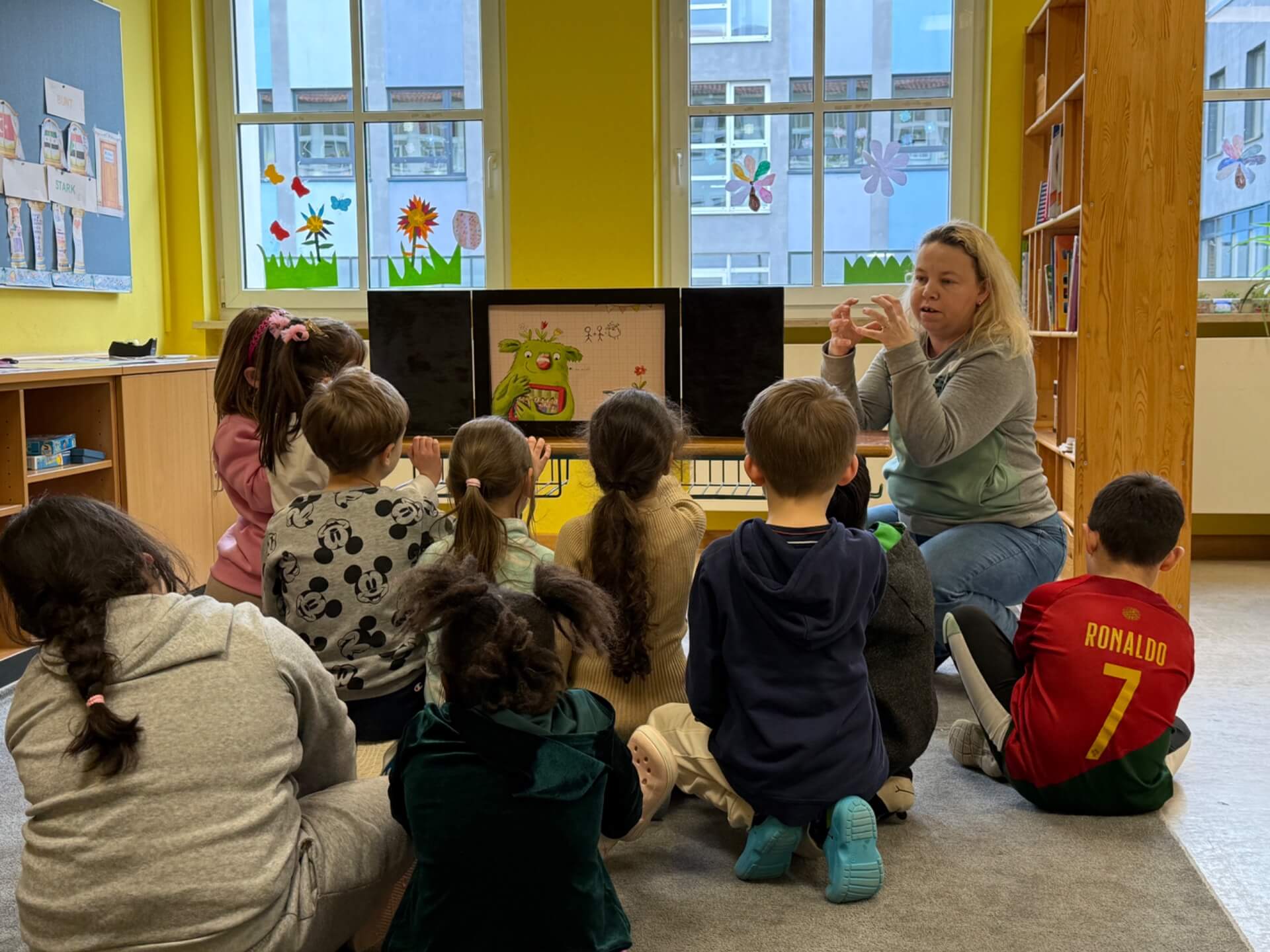 Im Rahmen ihrer Facharbeit führte Claudine in ihrer Gruppe (erste Klasse) ein Kamishibai- Erzähltheater zum Thema "Das kleine WIR in der Schule" durch. Mithilfe bildgestützten Erzählens wurde den Kindern vermittelt, wie wichtig Zusammenhalt und ein respektvoller Umgang miteiander sind. Die Geschichte zeigte anschaulich, dass das "WIR" durch freundliche Worte und gute Taten wächst, während es druch negative Verhaltensweisen kleiner wird. Dabei wurde auch das Thema Mobbing kindgerecht aufgegriffen. Die Schülerinnen udn Schüler beteiligten sich begeistert und kannten das Angebot teilweise bereits aus dem Kindergarten. Insgesamt war dies eines von drei Projekten, die Claudine im Rahmen ihrer Facharbeit umsetzte.