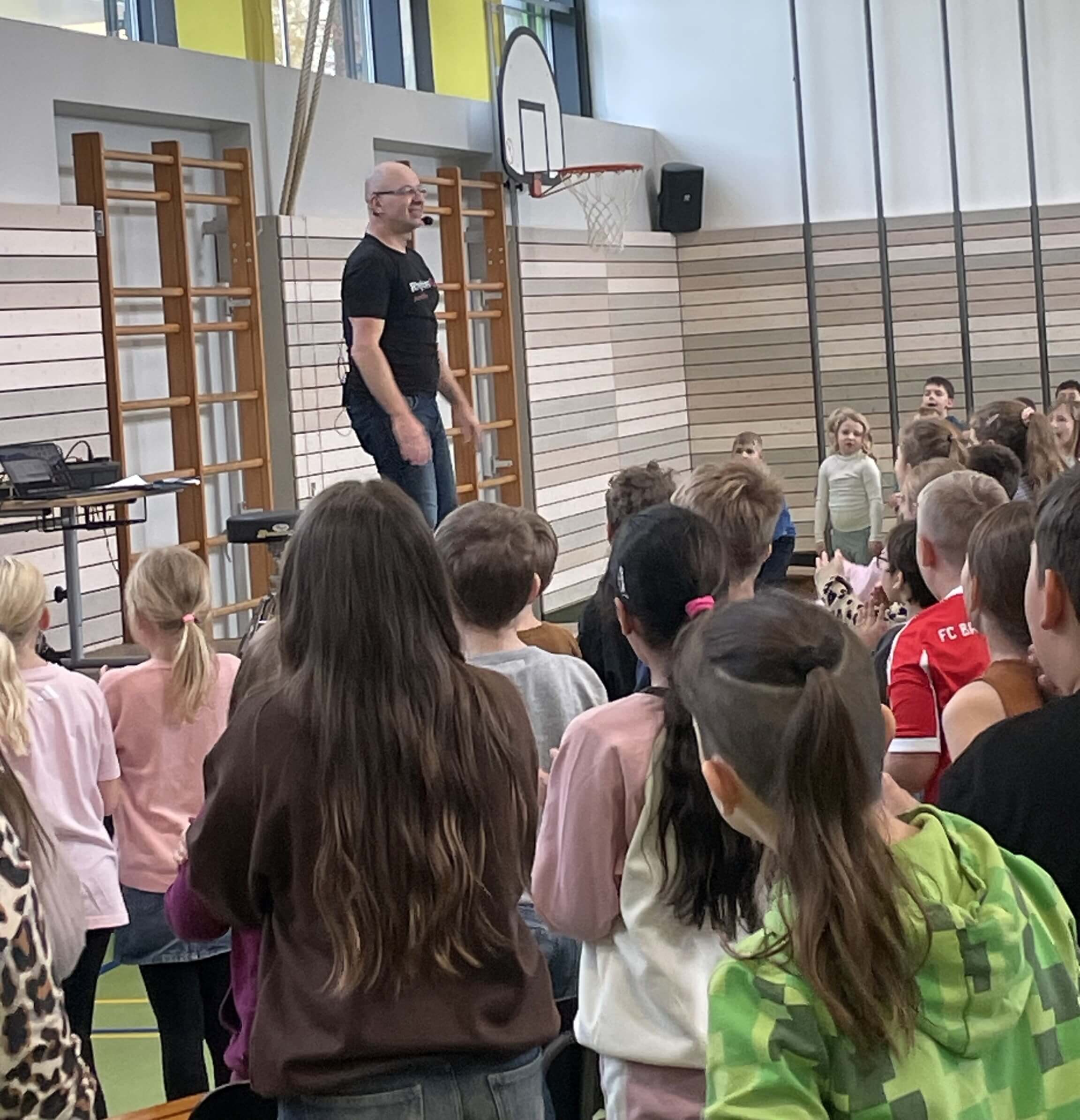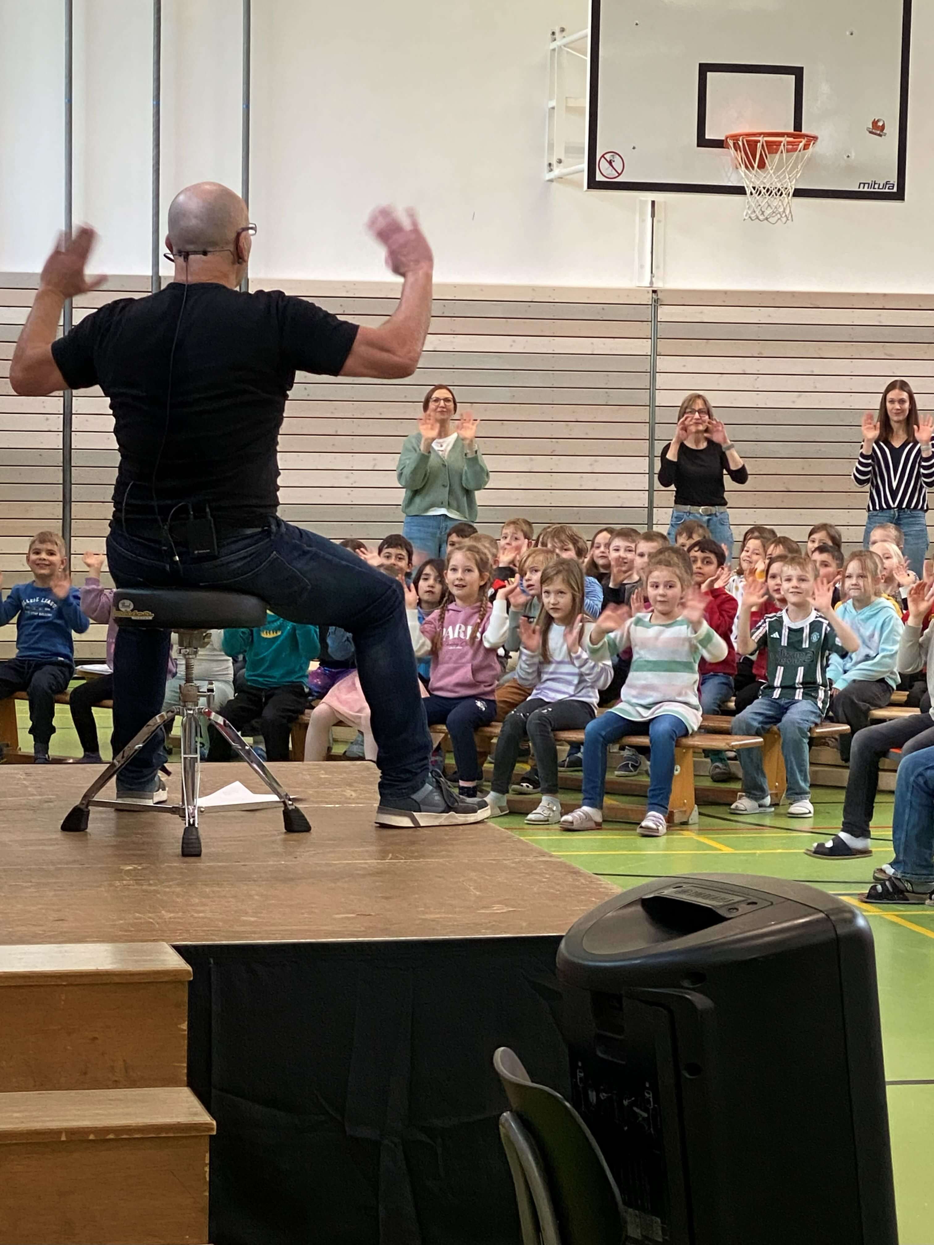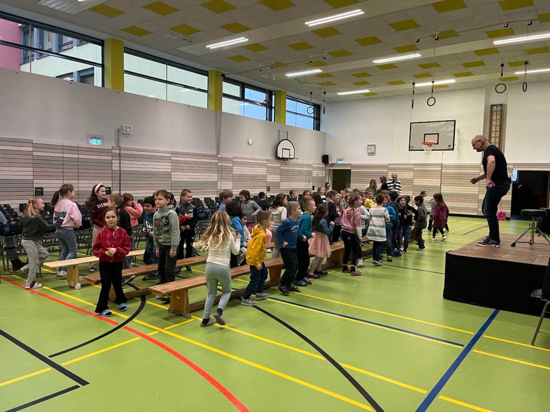 Im November durften wir einen besonderen Vormittag mit Dr. Filz, österreichischer Komponist, Musiker, Autor und führender Experte in Body Percussion, erleben. Jede Jahrgangsstufe arbeitete eine Schulstunde lang an einer Body Percussion-Choreographie. Von trommelnden Bewegungen bis zu synchronen Schlägen entwickelten unsere Kinder gemeinsam mit Dr. Filz ein buntes, lustiges Programm. Dies stärkte nicht nur den Takt, sondern auch Koordination und den Gruppensinn.