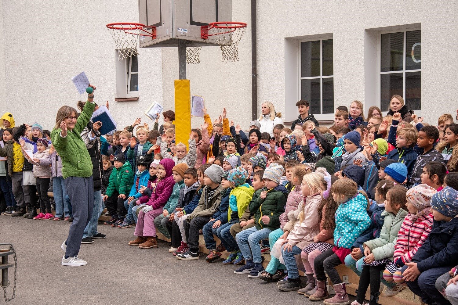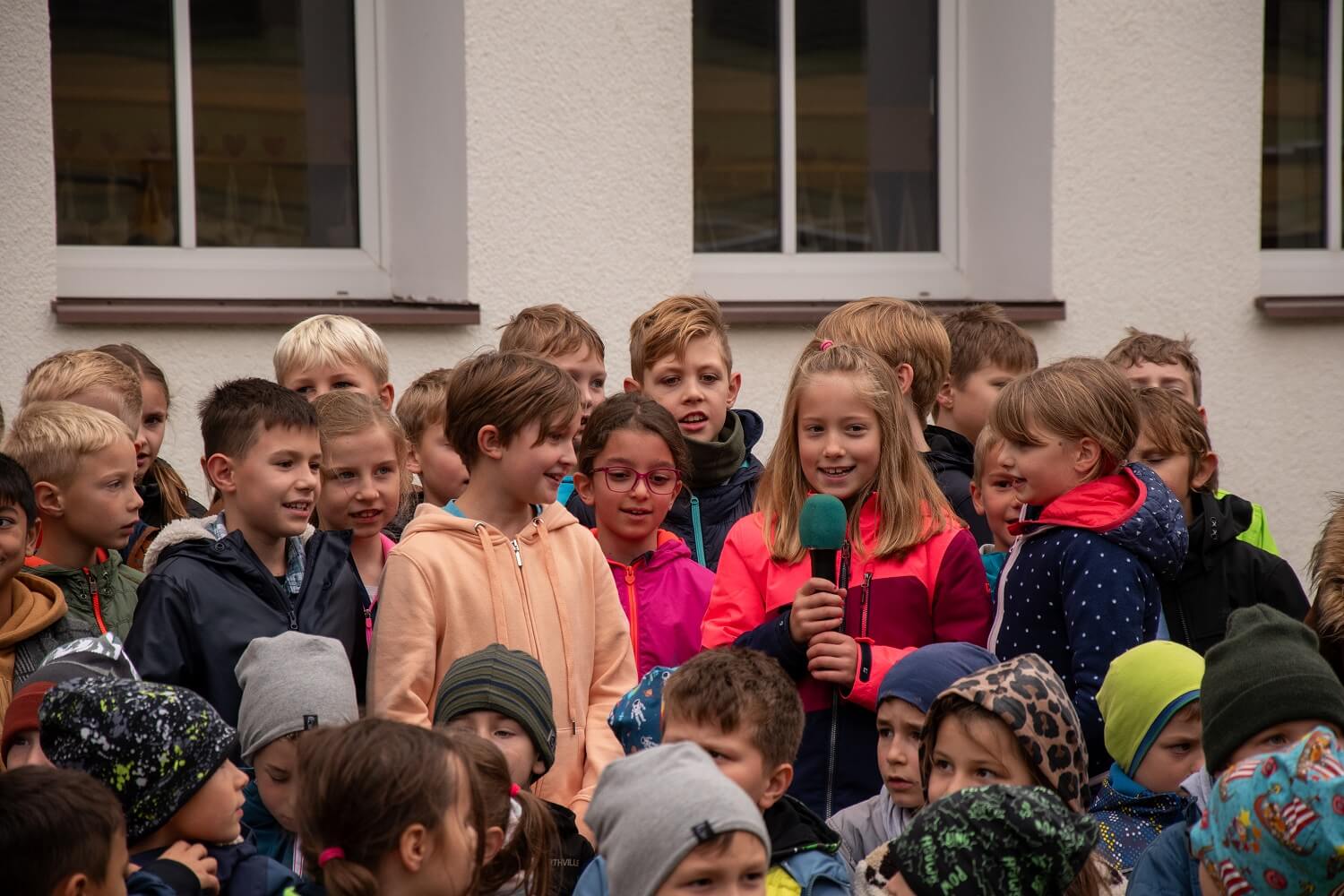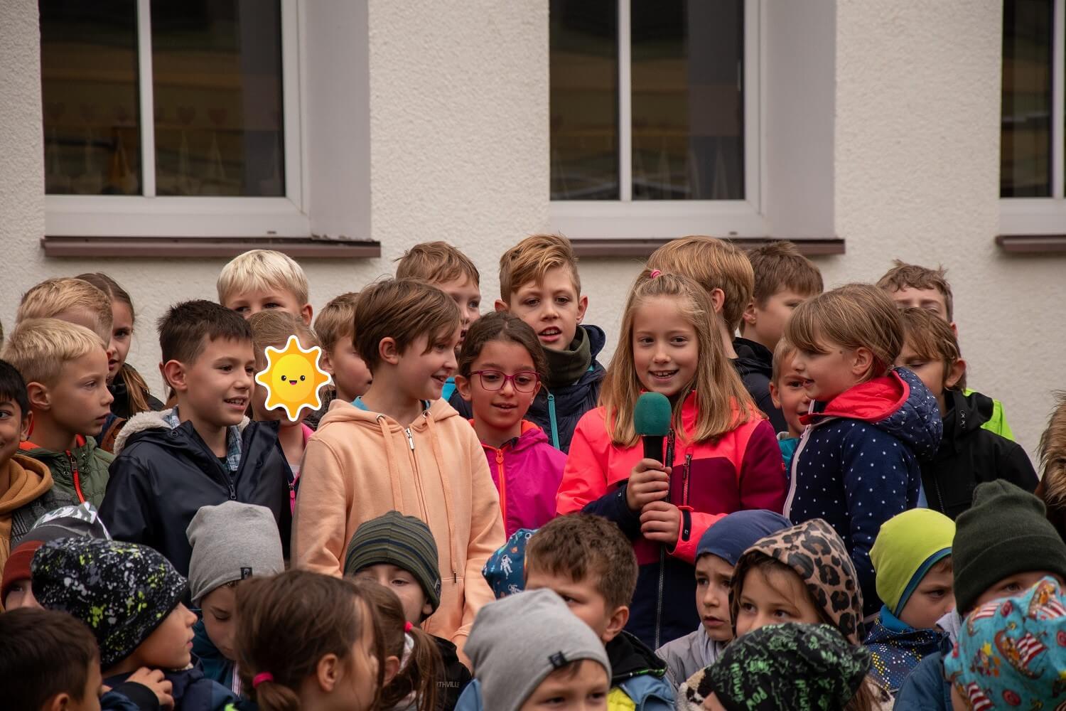 Alle Kinder, Lehrer, Vertreter des Elternbeirats und Fördervereins unserer Grundschule haben sich am Pausenhof versammelt und waren sehr aufgeregt. So lange haben wir der Eröffnung entgegengefiebert! Die Viertklässler haben sogar schon vier lange Jahre auf diesen großen Tag gewartet.
