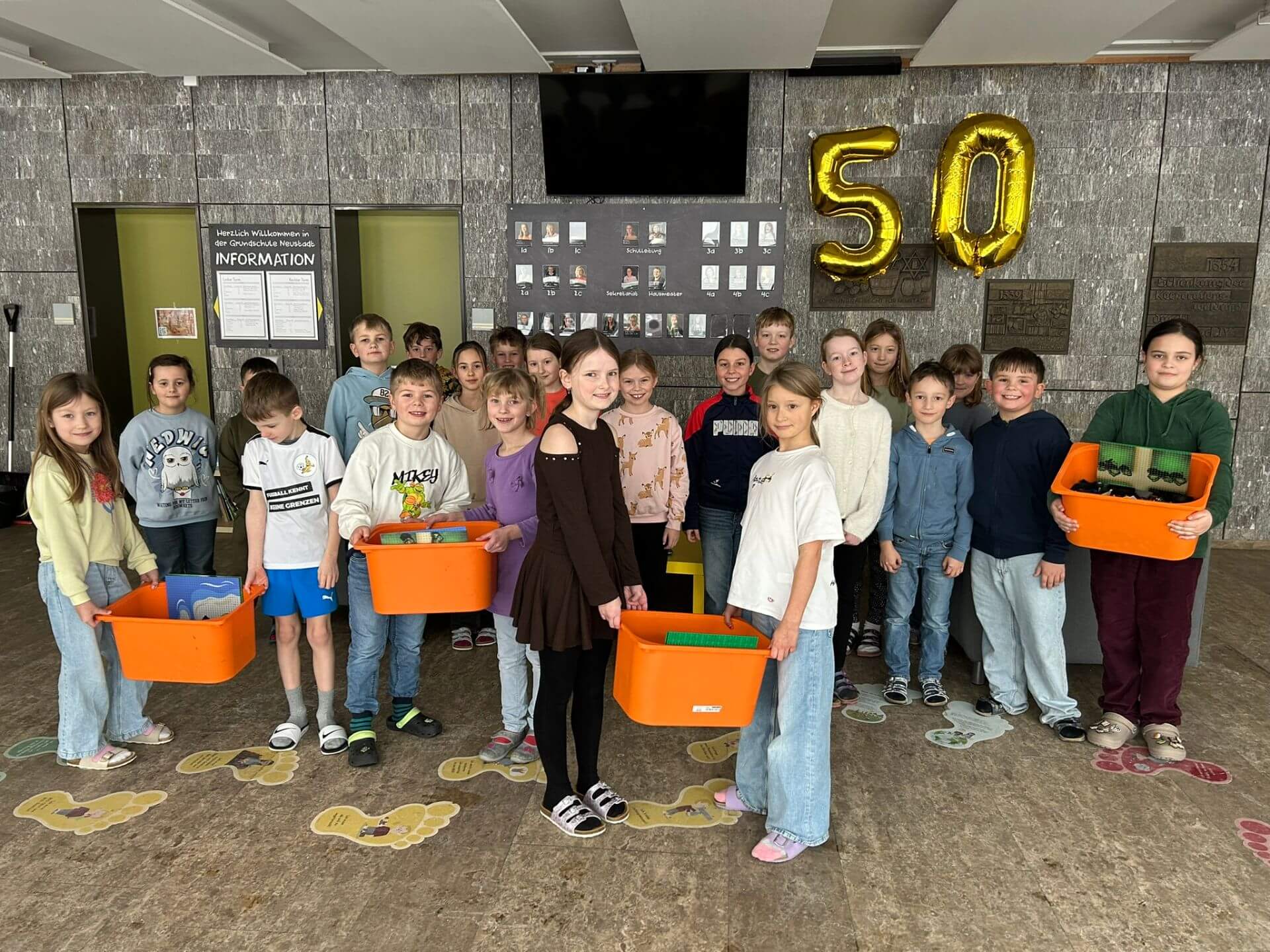 Die Freude bei allen Schülern war groß, als die Klassensprecher das Geschenk des Fördervereins in die Klassen brachten. Vier große Kisten mit Legobausteinen verschönern nun die Regenpause.