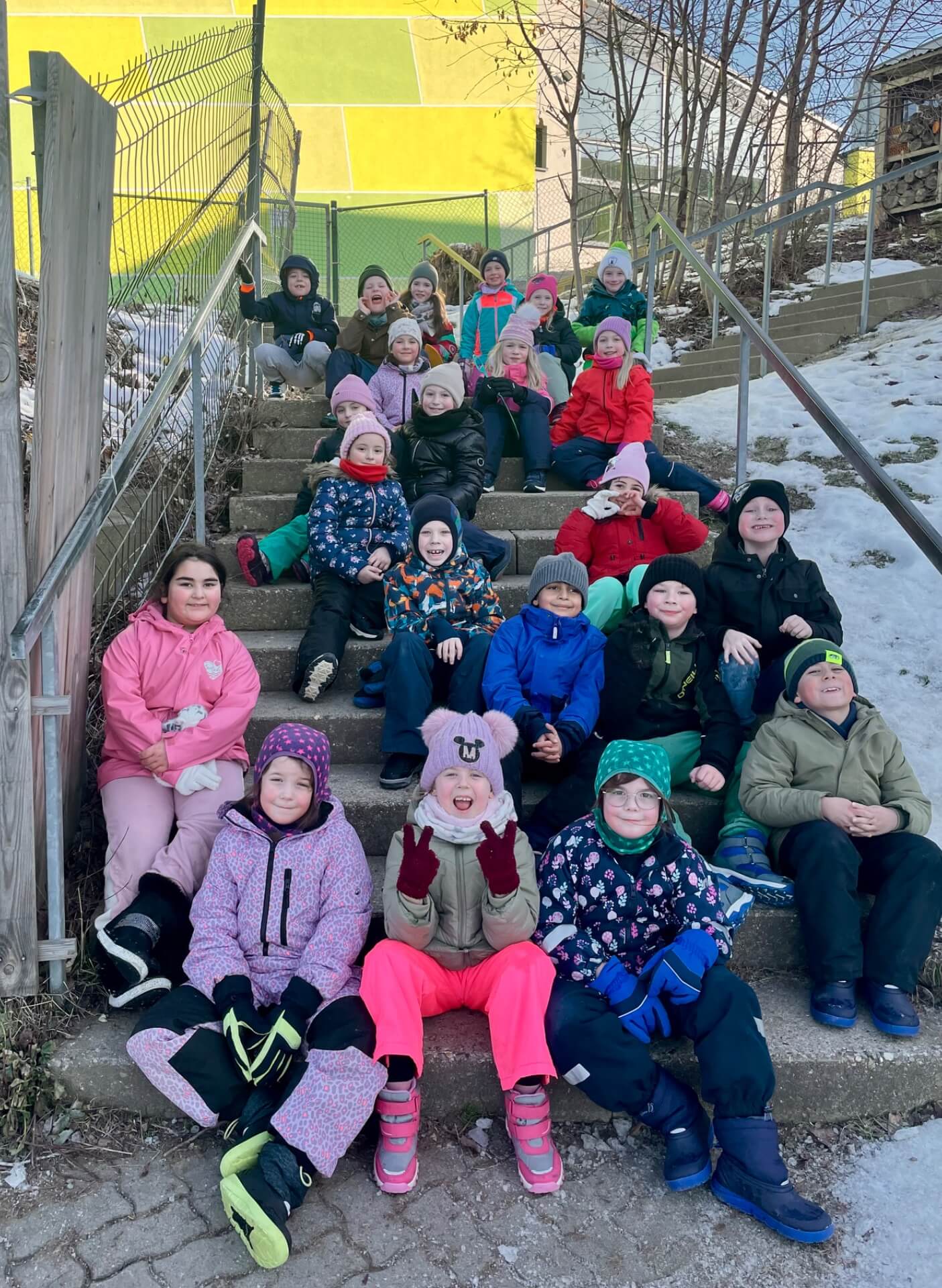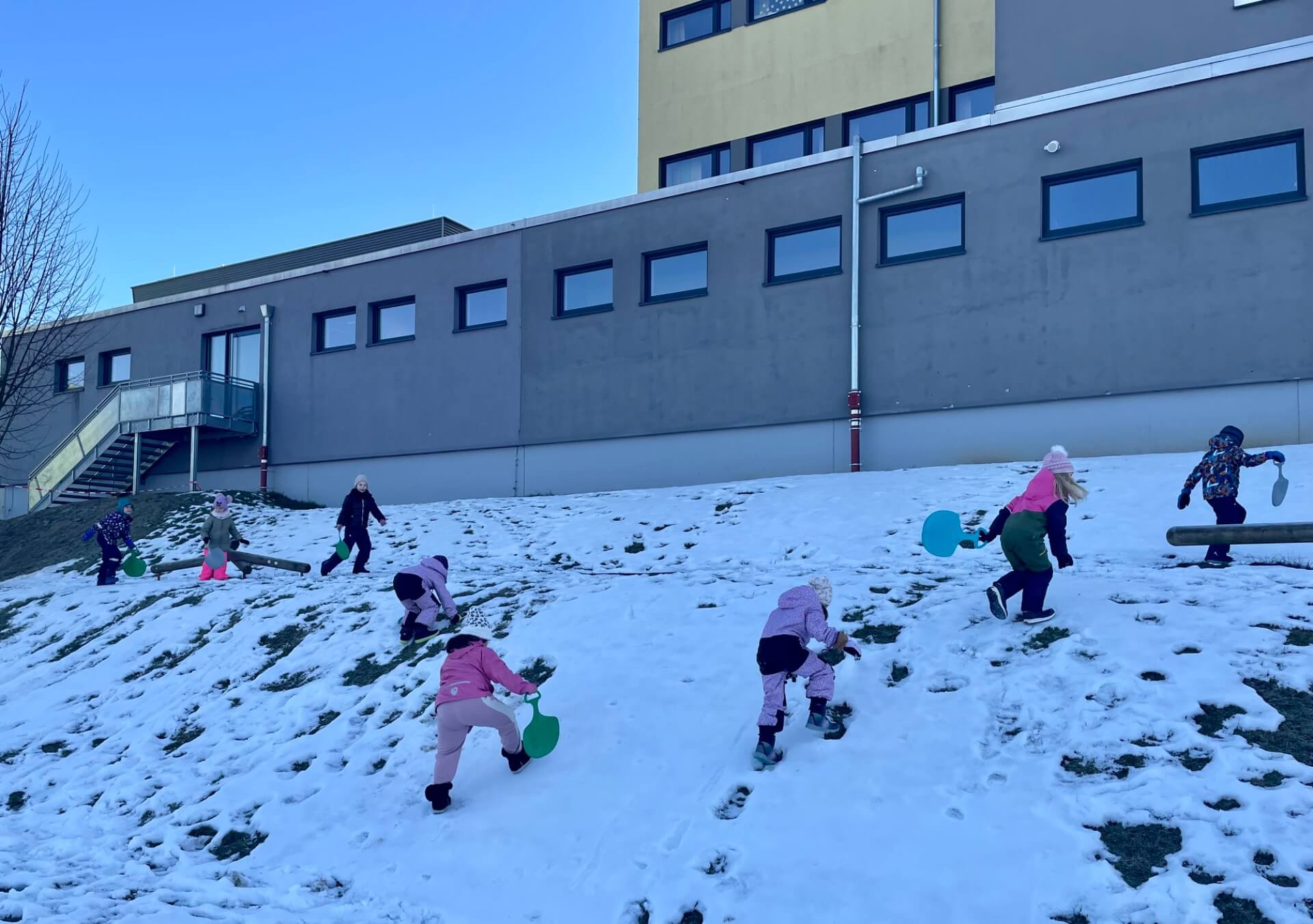 Das winterliche Wetter wurde von der Klasse 1a genutzt, um am Sportplatz die Hügel hinunter zu sausen. Das war ein Spaß!